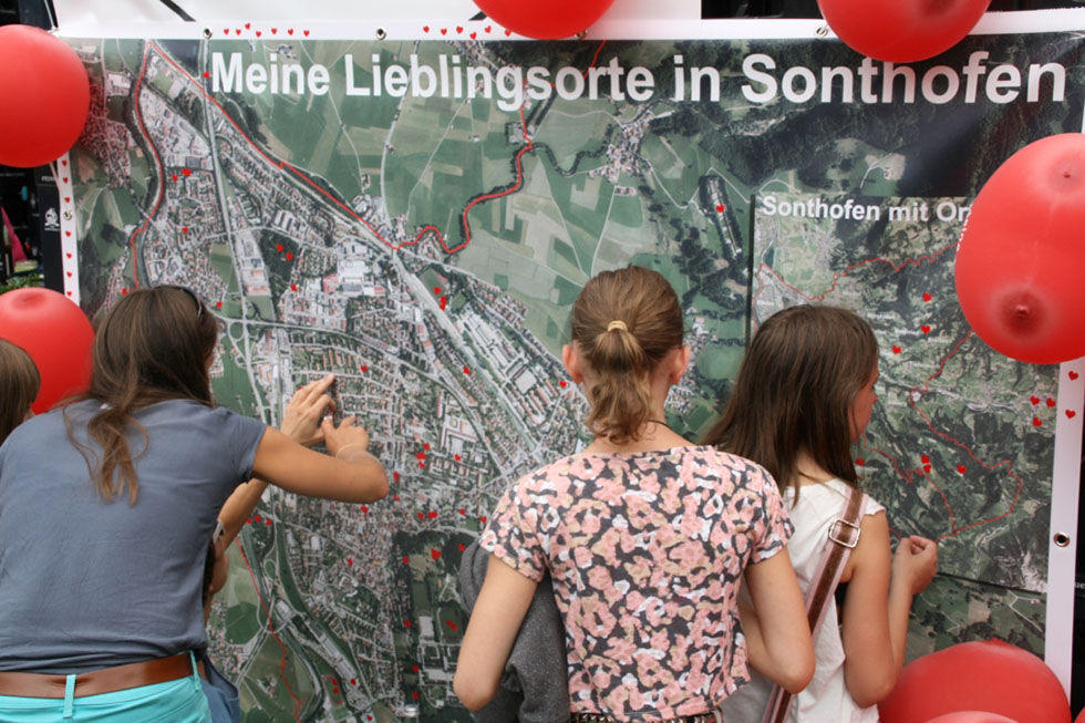Die BAUSTELLE SONTHOFEN ist unter dem Motto „Liebe Deine Stadt“ mit dabei und fragt die Festbesucher nach ihren Lieblingsplätzen in der Stadt und Umgebung. Diese kann man dann mit Aufklebern auf einem überdimensionalen Luftbild markieren. So entsteht Stück für Stück eine „Wohlfühl-Karte“ Sonthofens, die immer wieder Stoff für interessante Gespräche liefert.