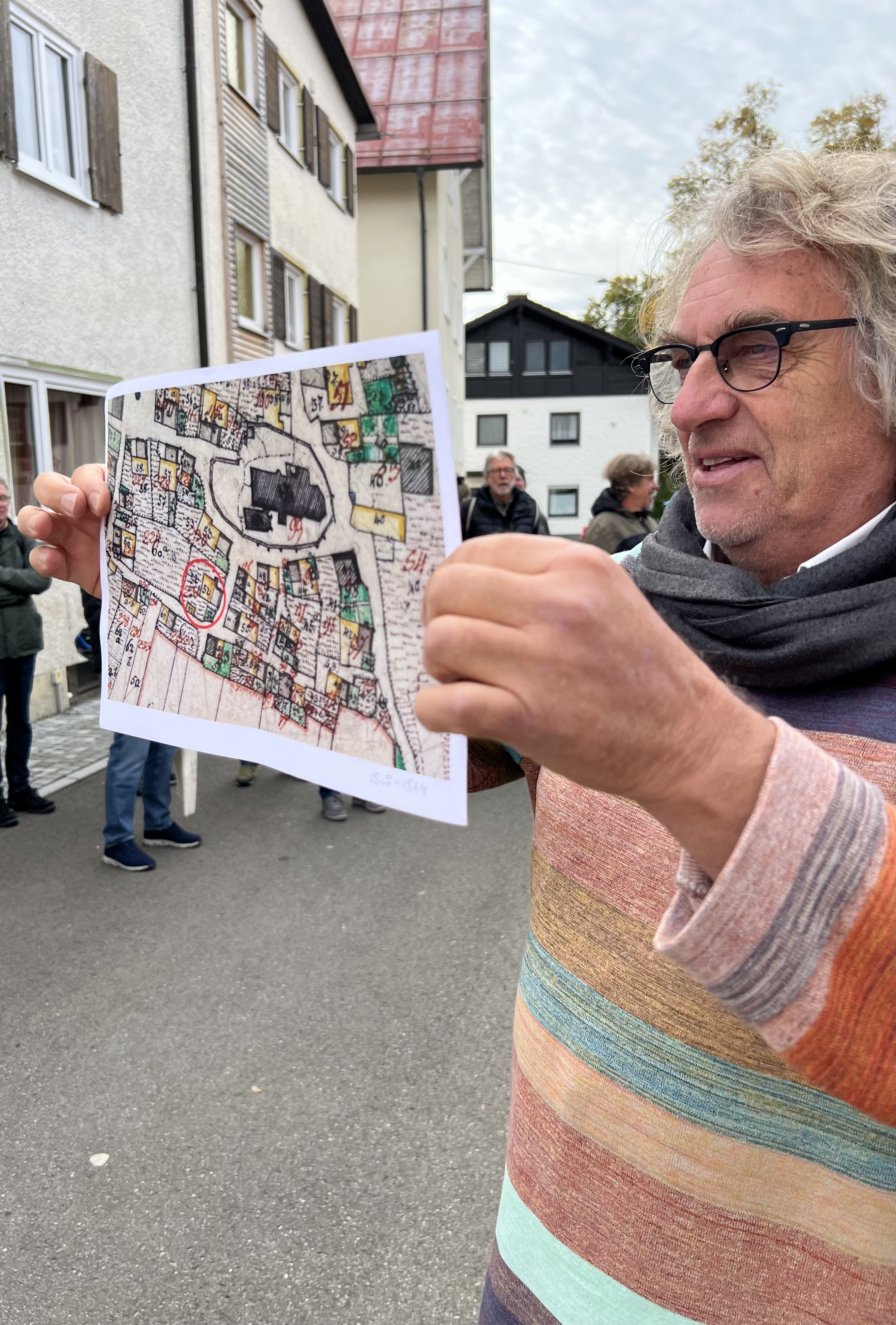 Die fünf Ausfallstraßen, die schon auf dem Plan von 1818 zu sehen sind, verbinden den Ortskern mit den umliegenden Gemeinden. Die Route führte dieses Mal von der Stadtbücherei Richtung Süden, die Marktstraße hinab zur Pfarrkirche.
